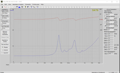 The impedance curve data shows a fundamental resonance (FS) at 365Hz however there is a strong resonance at 2kHz. The driver shows strong inductive rise starting at 3kHz.