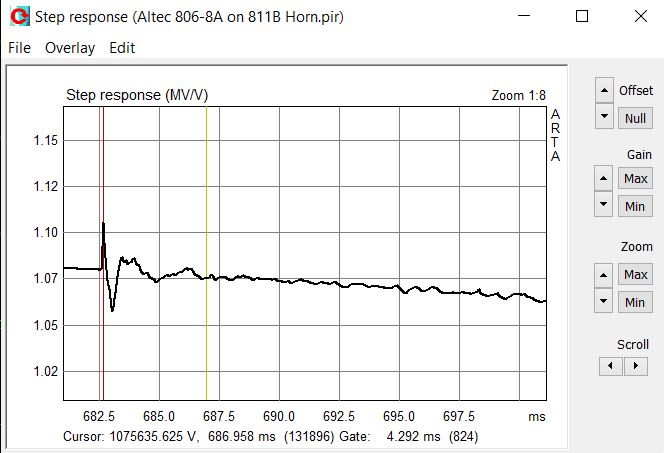 The 811B horn does nothing to help the performance of the 806-8A driver. In fact the 811B has rolloff starting at 8kHz which forces one to look at super tweeter options. The 811B does offer wide coverage from 1kHz to 8kHz however it is relatively ragged due to reflection artifacts which show up in the time domain measurements such as step response and burst decay. These artifacts will blur transient detail through the passband and at best give the horn a particular sonic signature of it's own.