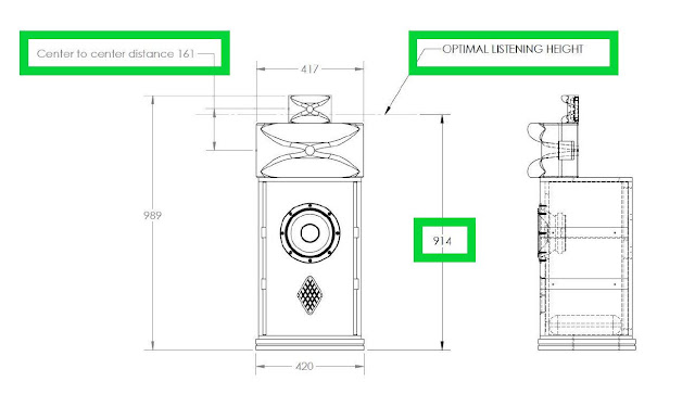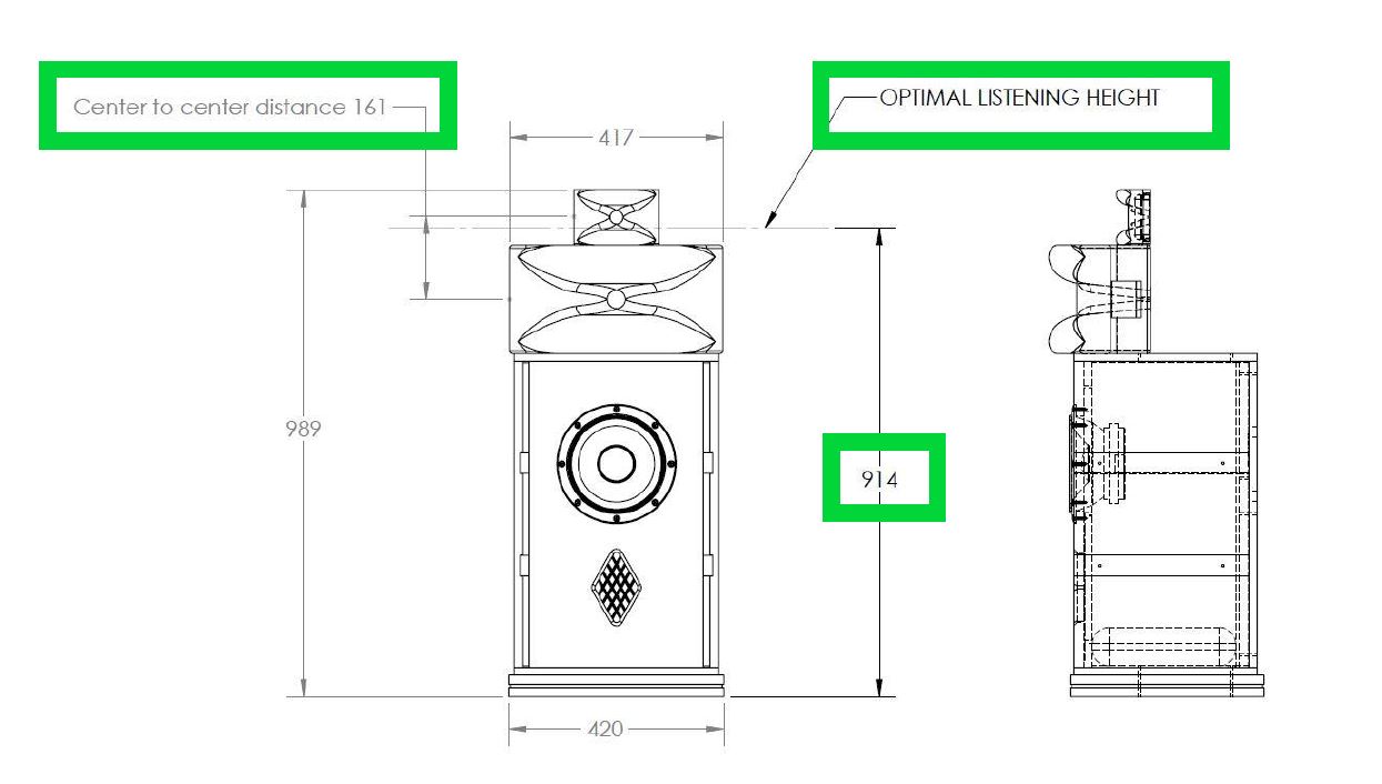 This configuration meets the 1 wavelength rule for driver center to center distance spacing. Often horn speakers will place the high frequency horn too far from the midrange horn resulting in a sound that is not coherent or integrated.