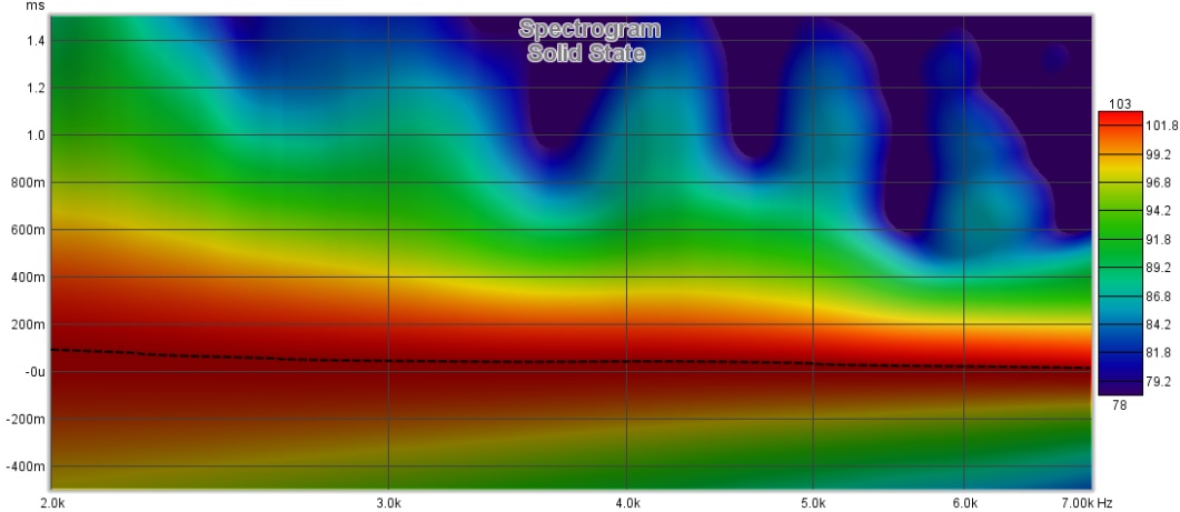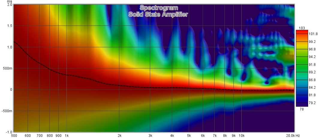 I decided to look at the Spectrogram results for both the solid state and tube amplfier to see if we could see any difference. The Spectrogram is the same as the Burst Decay that's used in ARTA. This shows how quickly the sound decays after the initial burst of sound from the measurement software. A quicker decay results in better low level detail retreival and better dynamic range. I've always preferred the sound of tube amplifiers when connected to high frequency compression drivers and this may confirm why.
