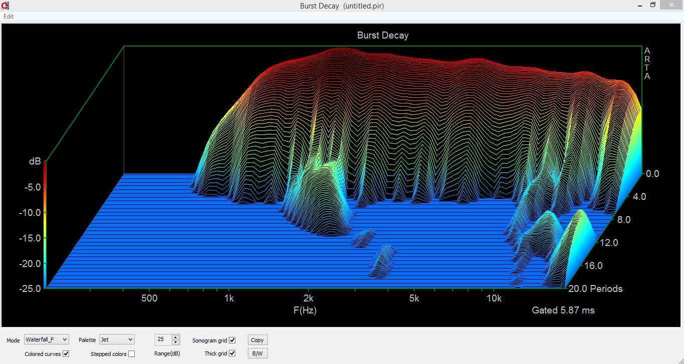 Continuing on here is the Burst Decay Result in ARTA. This shows how quickly the driver and horn decays after the initial burst of sound generated by the measurement software. A quicker decay means less resonance, better low level detail retrieval, and higher dynamic range.