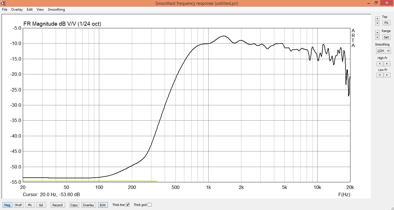 The results show a more linear response than the RCF ND-650. Using a simple first order crossover yields a textbook perfect response out to 19kHz. Continuing with my measurements checked the frequency response in ARTA which is usually a little less embellishing than REW.