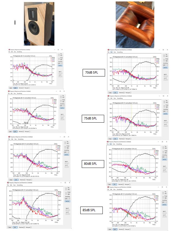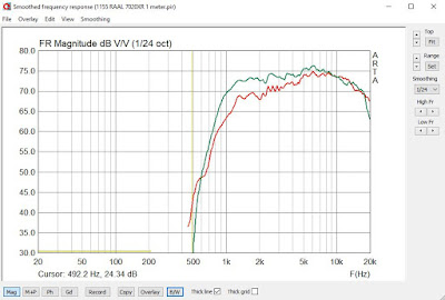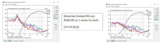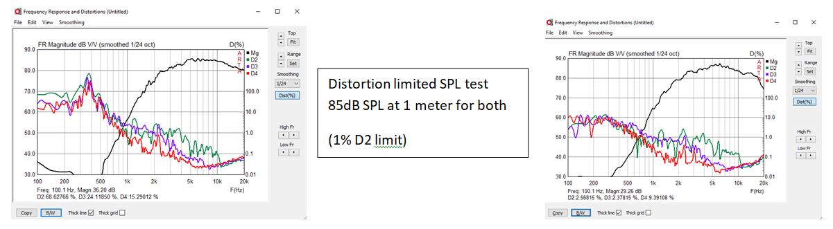 For this project I was not able to show any distortion advantage to the horn. I'm not sure why this was the case. One thing that seemed very unusual was how quickly distortion set in as loudness increased. Using a distortion limited SPL test I found that the RAAL 70-20XR had a maximum SPL of only 85dB at 1 meter. You would have to decide if this is a limitation for you or not based on your listening habits, music style, and room size. Personally I would want more output from the RAAL since you also have to factor in headroom for dynamic peaks in the music. Please note the distoriton measurements were done with a 7.8uF capacitor to protect the tweeter which is why the frequency response does not look as flat as the raw response. Click HERE For the PDF version of below.