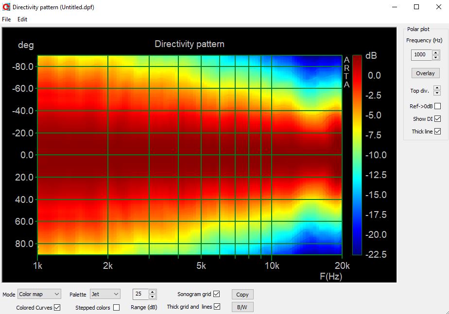 The horn provides a nice gradual narrowing of directivity with no edge diffraction artifacts. The coverage window remains wide at 100 degrees at 13kHz.