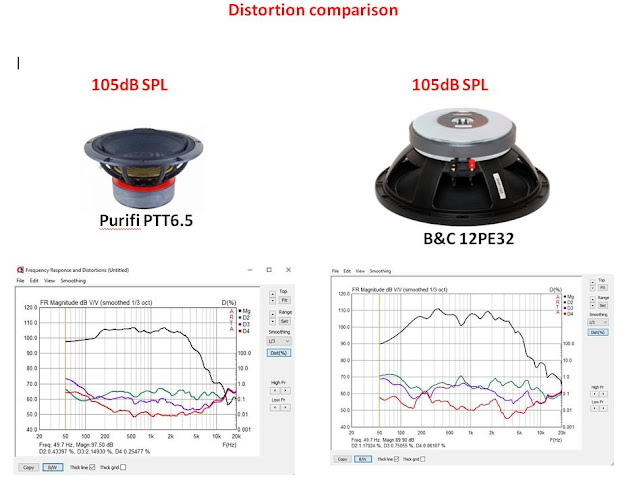 Purifi advertises the PTT6.5 as having the same low distortion as a much larger driver such as those used in large scale studio monitors. Typically these large studio monitors will employ a 10" or 12" mid-woofer to cover the mid-bass and lower midrange. To test Purifi's claim I conducted a direct comparison against the B&C 12PE32 12" Mid-woofer in a small sealed enclosure. A distortion sweep at 100dB reveals that the Purifi does in fact produce less distortion than the B&C 12PE32!