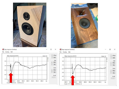 The system step response is compared below. The non-horn test baffle shows some misalignment in the time domain where the tweeter is a ahead of the woofer's impulse response. (see red arrows)