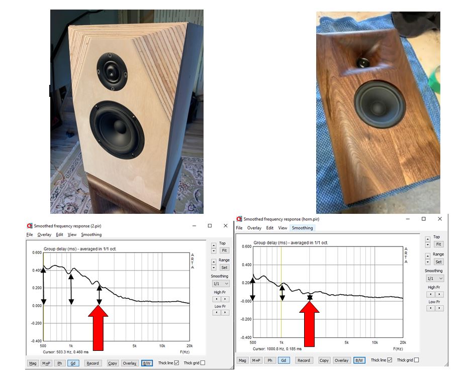 The group delay also shows the advantage to the physical time alignment of the drivers. The non-horn loaded test baffle has the woofer trailing the tweeter by about 0.13 milliseconds which correlates to the 40mm distance that I've recessed the tweeter into the horn.