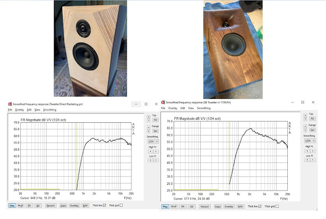 The SB Acoustic drivers are excellent sounding drivers. The woofer provides very nice textured bass that is delicate and refined. The tweeter with the 1159 horn provides improved dynamics and overall clarity. Vocals are rendered with proper timbre and projects into the room with much more realism than the non-horn test baffle. I was surprised how much the sound degraded with the non-horn baffle, which at times sounded 'hashy' (is that a word?).