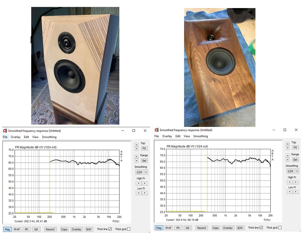 I then conducted the following measurements with the woofer included in the test. I implemented a 2kHz 12dB/LR filter for 1159 and the test baffle. I've shown the resulting frequency response in the images below.