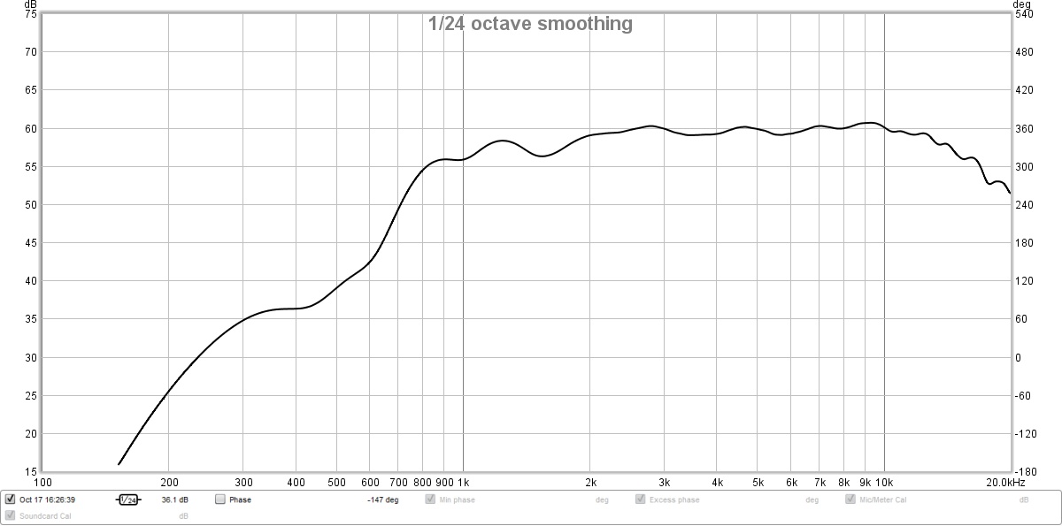 Below is the measured frequency response of the TAD TD-2001 with the ES-800 Biradial Wood Horn as measured in REW software.