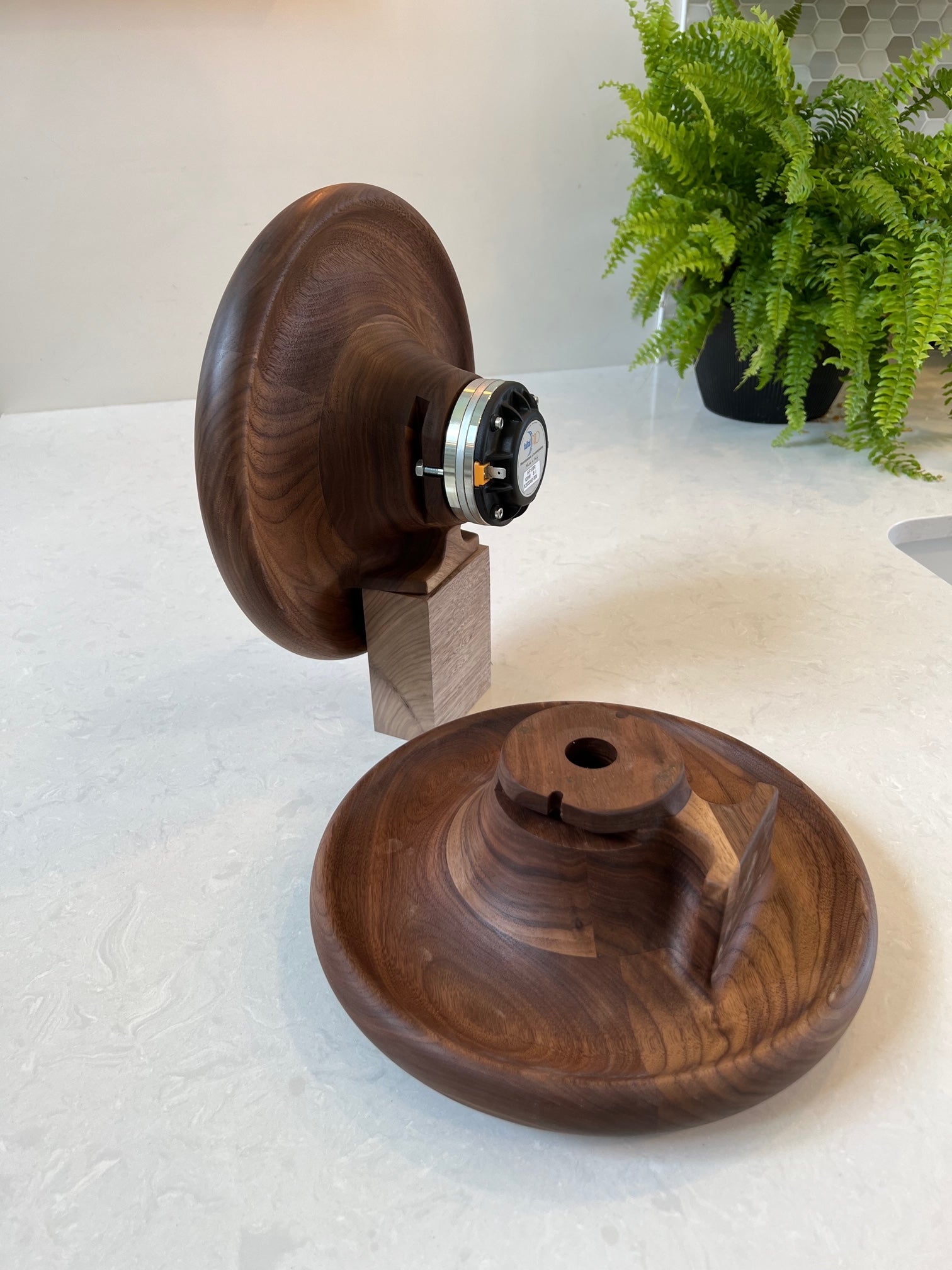 These horns are constructed from solid walnut hardwood. The horn is precision CNC machined from a solid piece of stock material. This means that no gluing of parts are done after machining. This ensures excellent fit and finish. The rear podium mount is integrated into the horn for an elegant appearance.