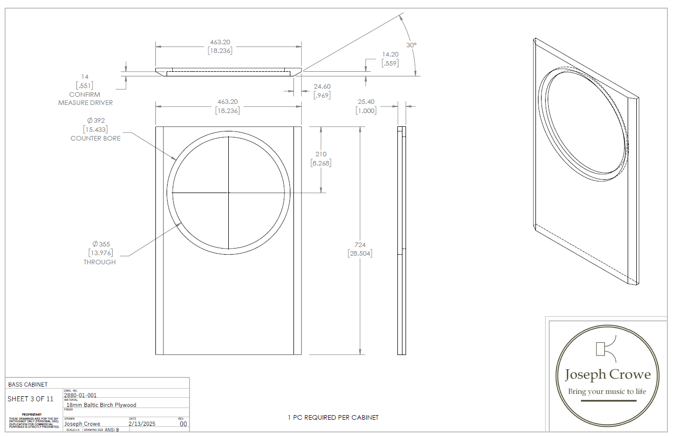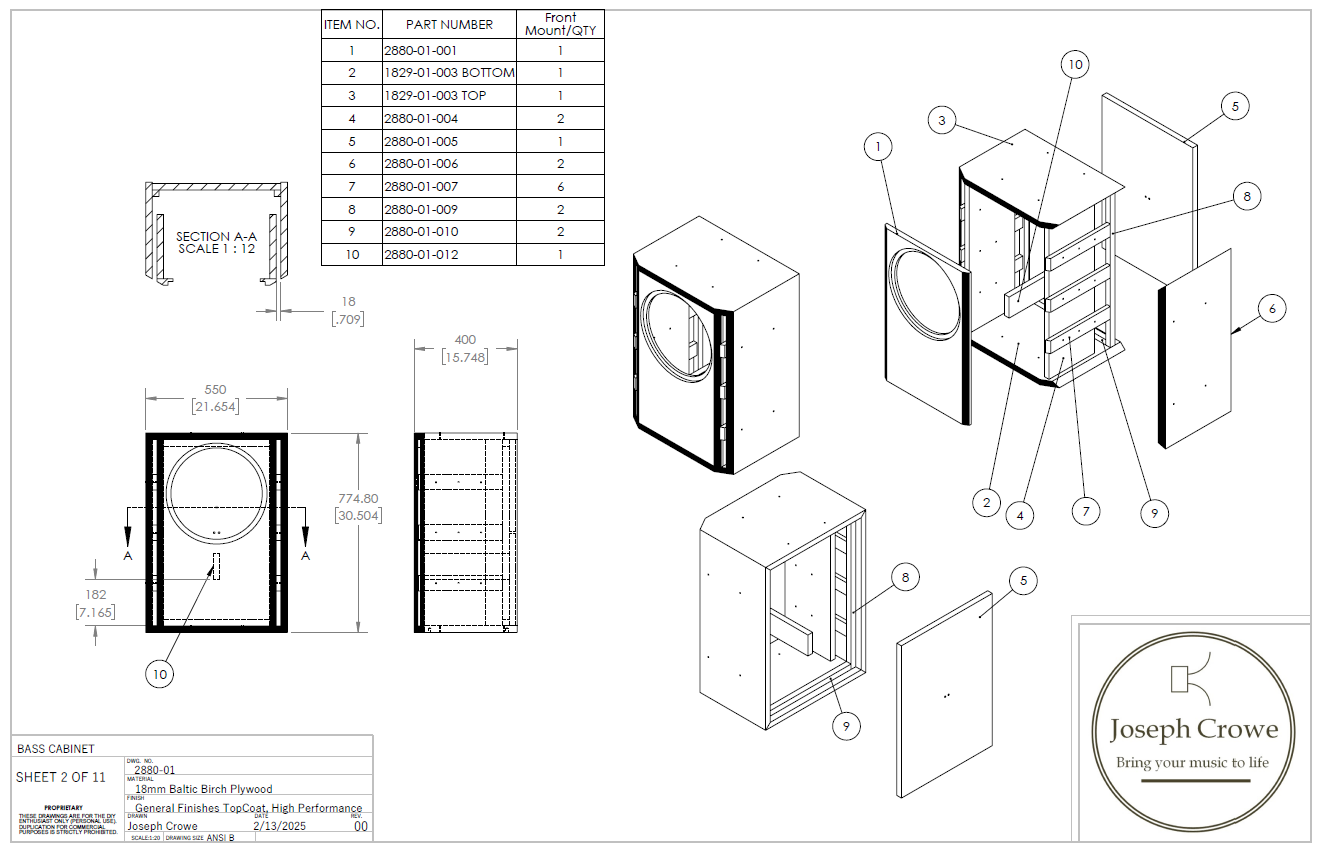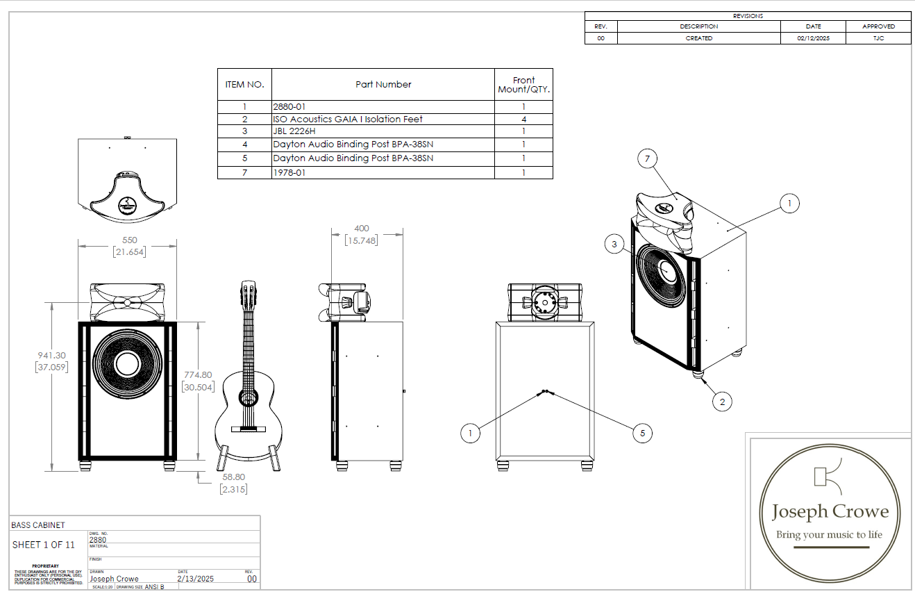 These plans include the assembly and detail drawings to construct bass cabinet No.2880