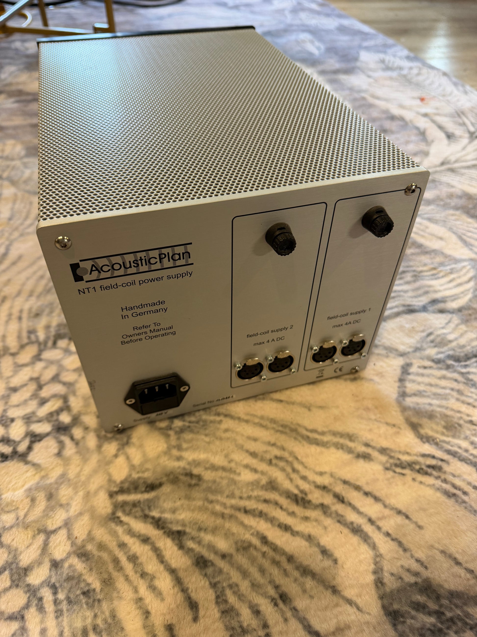 The Line Magnetic field coil compression drivers are accurate reproduction units of the renowned Western Electric W555 and 597 from the 1940’s. The field coils are powered by a solid state power supply by Acoustic Plan NT1 (hand made in Germany). Voltage is adjustable using the front control knobs and displayed on the digital display. (See photos)