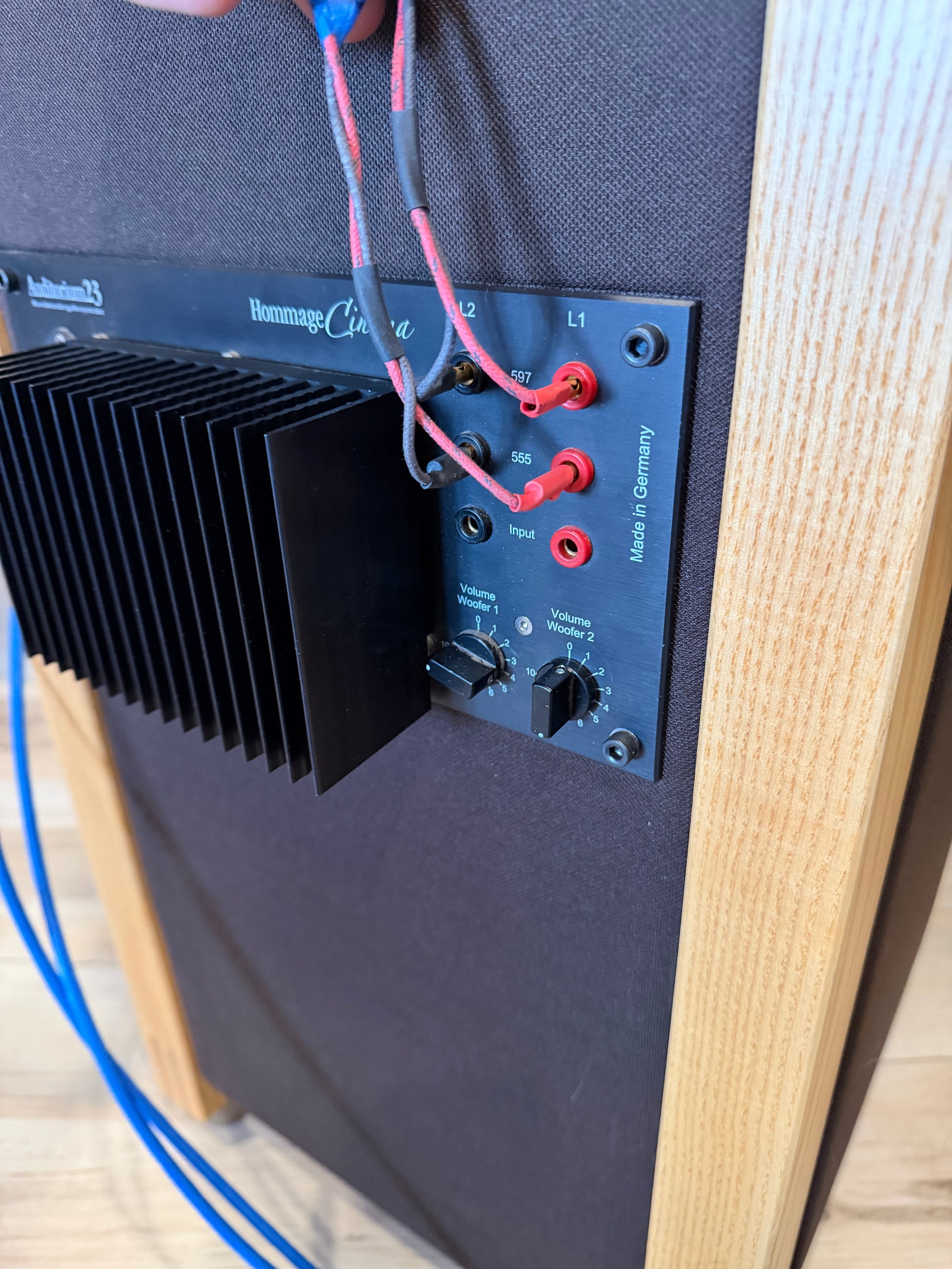 The bass cabinet houses both a mid-bass driver and a bass driver. Both drivers are powered by an internal plate amplifier running in class AB. The low pass filters for the midbass and bass are done electronically (analogue) inside the plate amp. There are individual level adjustments for midbass and bass.